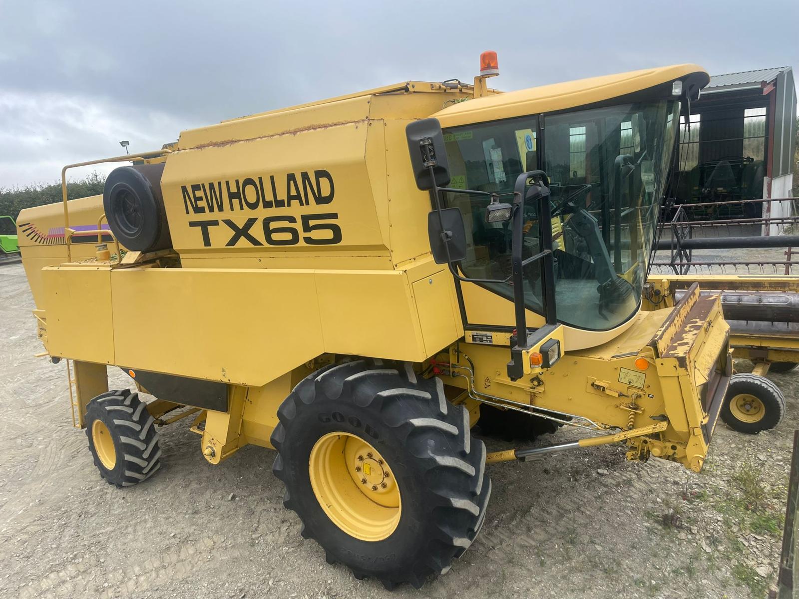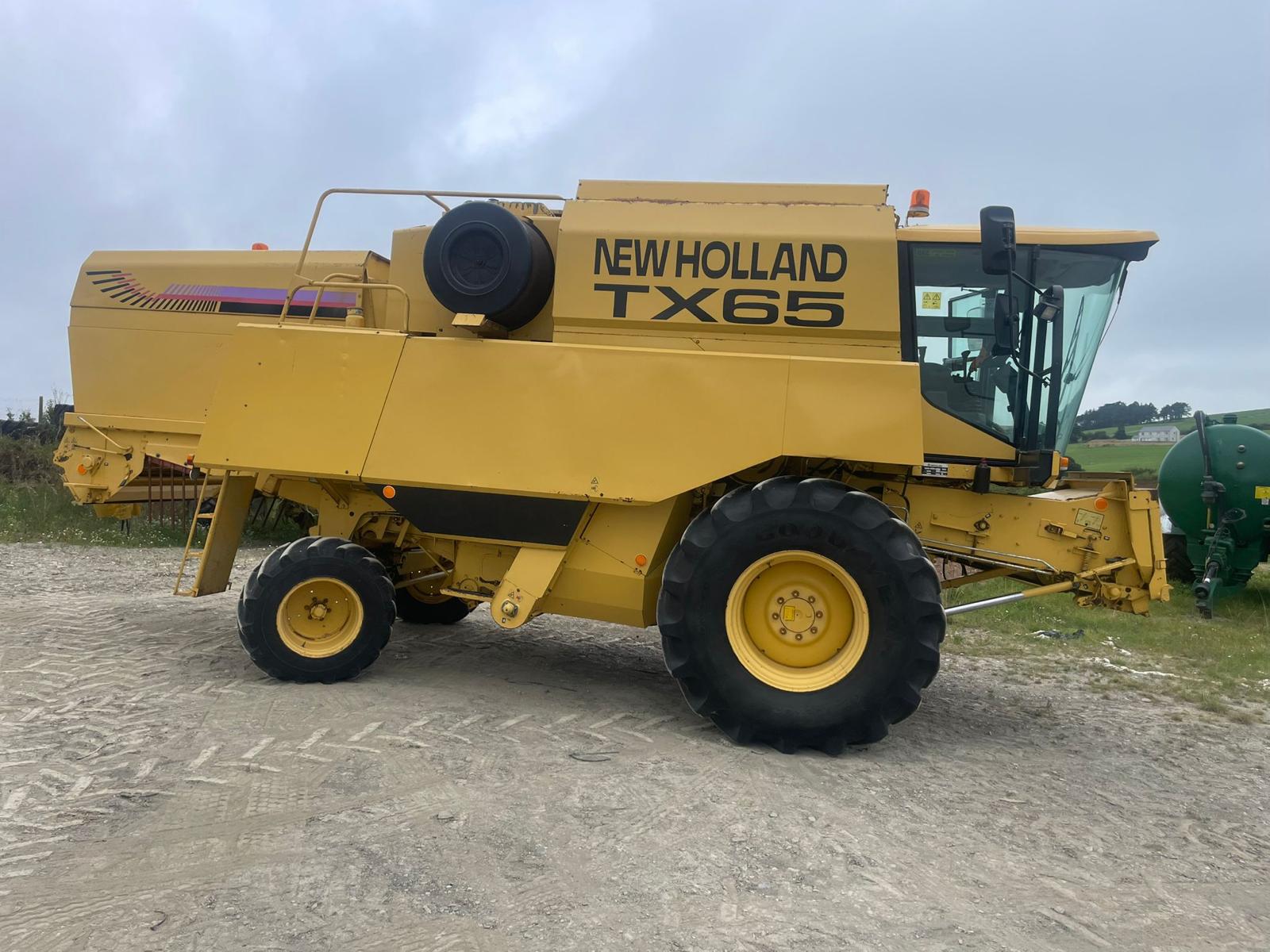 Well-kept second-hand New Holland TX65 combine for sale, fitted with a 17 ft header, self-levelling sieves and a hydraulic multicoupler, a solid, dependable machine ready for the field.